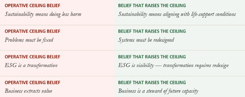 The Belief Architecture Diagnostic surfaces the operative beliefs governing your organization’s sustainability decisions across the twelve belief pairs that determine where the ceiling lives. The output is a Belief Gap Map: a named, structured document that identifies where the gap is widest, which decisions it has been producing, and what the transition required to close it looks like.