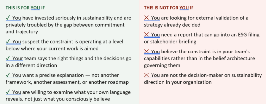 There is a second signal worth naming. Organizations where the sustainability director or project lead can communicate freely across silos, connecting what they are working on to the people in procurement, design, and capital allocation, are organizations whose belief architecture is reachable. Organizations where that connection is structurally blocked are those whose operative beliefs encode the ceiling into the org chart. The Diagnostic surfaces the situation you are actually in and what is producing it.