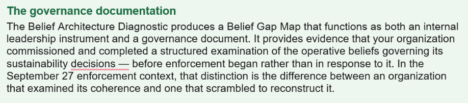 From September 27, 2026, generic sustainability claims are legally actionable in EU and UK markets without substantiation traceable to the decisions that produced them. The Belief Architecture Diagnostic is the only instrument that identifies where those decisions diverged from those claims — and what closing the gap requires.