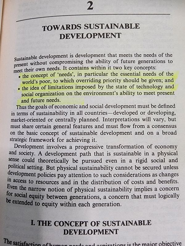 You can see from the FULL DEFINITION of sustainable development that the most often quoted definition is only the first sentence of the chapter (#2) entitled "Towards Sustainable Development.